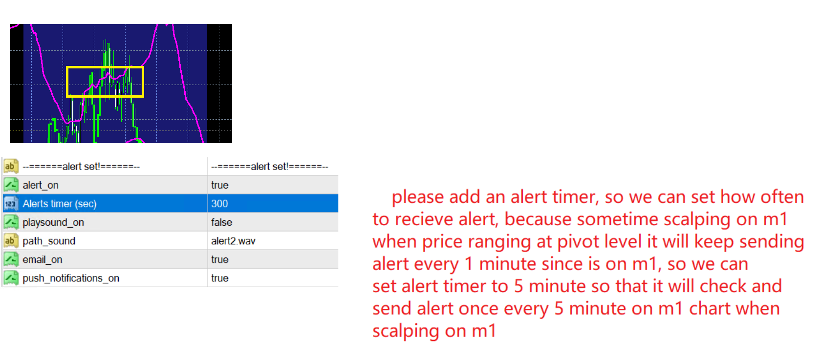 1. please add an alert timer, so we can set how often to recieve alert, because sometime scalping on m1