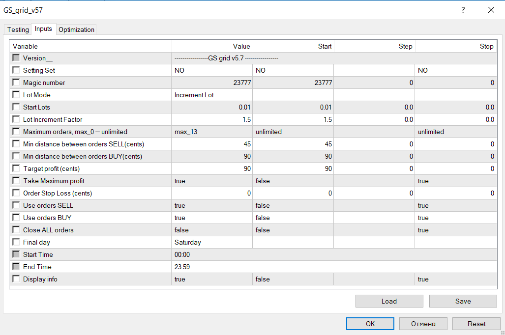 GS grid uses a universal algorithm and can work on various currency pairs and timeframes. Version 7.7 has lowered martingale settings, which