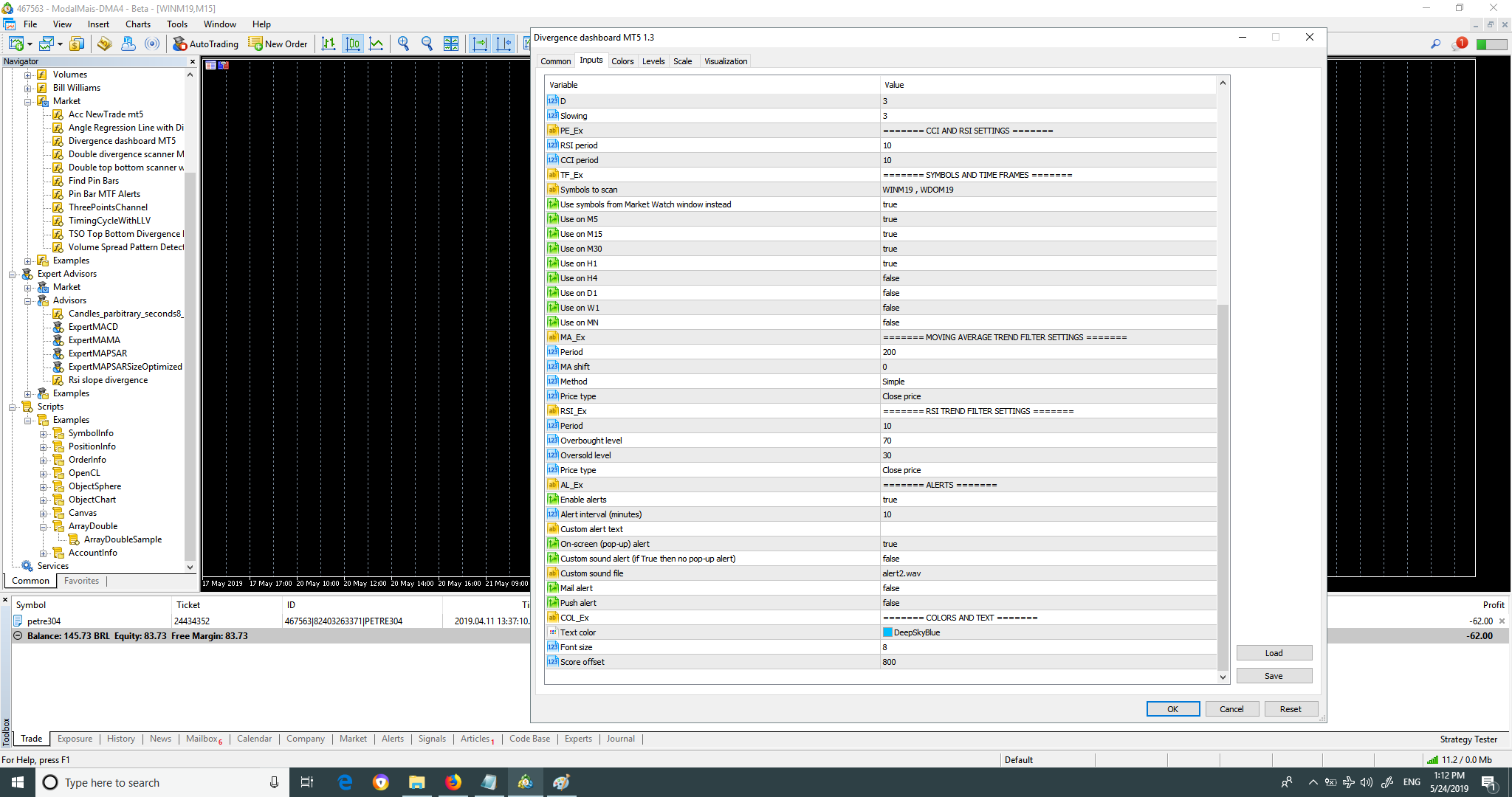 Hello, thanks for your reply, ok, I set a first configuration change symbols to WINM19 AND WDOM19 as you can see I set 'Use symbols from Market Watch window instead' to TRUE, so after tests, it shown me the table with symbols and times running well. But after it did not run well more...you can see on the third pic seems it have, even after deleted, message error cant load symbols USDJP.