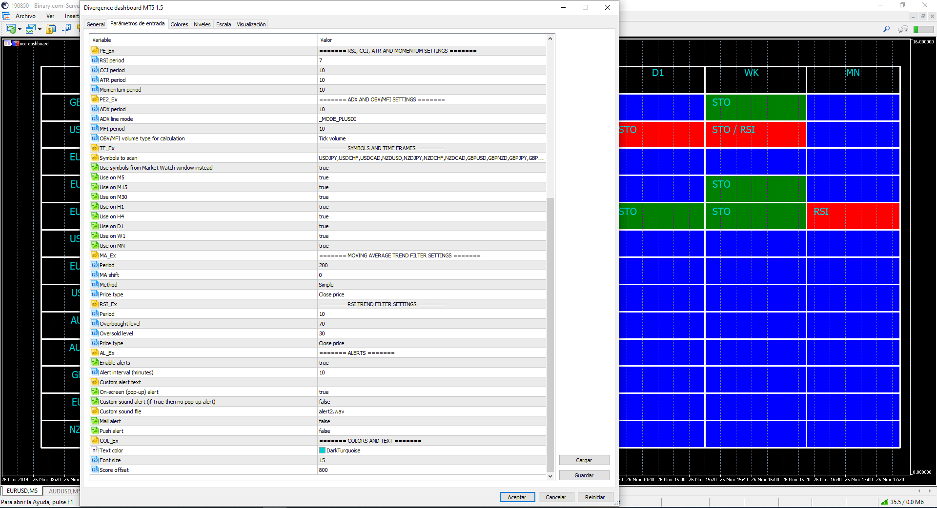 de momentos tengo un inconveniente no logro que la alarma me indique mediante PopUp de si ha aparecido una divergencia. Necesito tu ayuda en este sentido para poder poner la alarma correctamente. Te envio 2 capturas de imagen para que veas como lo tengo seteado las opciones.