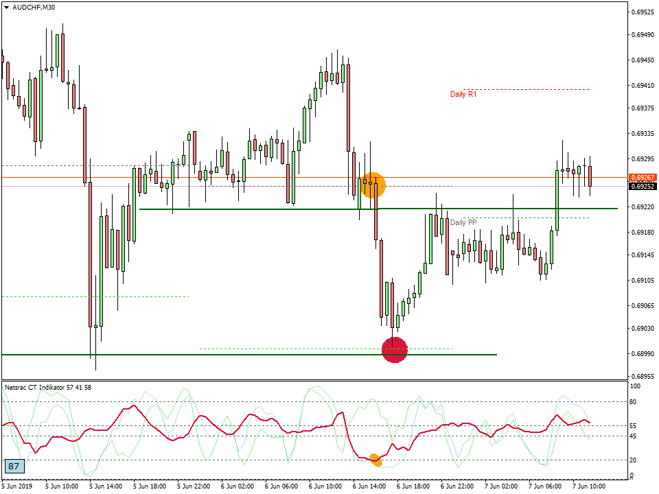 What did the EA do? The EA gave the signal at the yellow dot - Buy AUDCHF/Sell AUDJPY. The entry is well chosen, there is support (upper green line). But the support does not withstand the pressure (and was tested often before...). With a big candle, the AUDCHF falls through. But there is still another (lower green line). Also, there is the Daily S1 Pivot (red dot). At this point, we should have helped our EA. If he has already made the long in the mode "Autotrade", then we have to go in here with another long order. This would have made our order cheaper and saved the hedge trade.