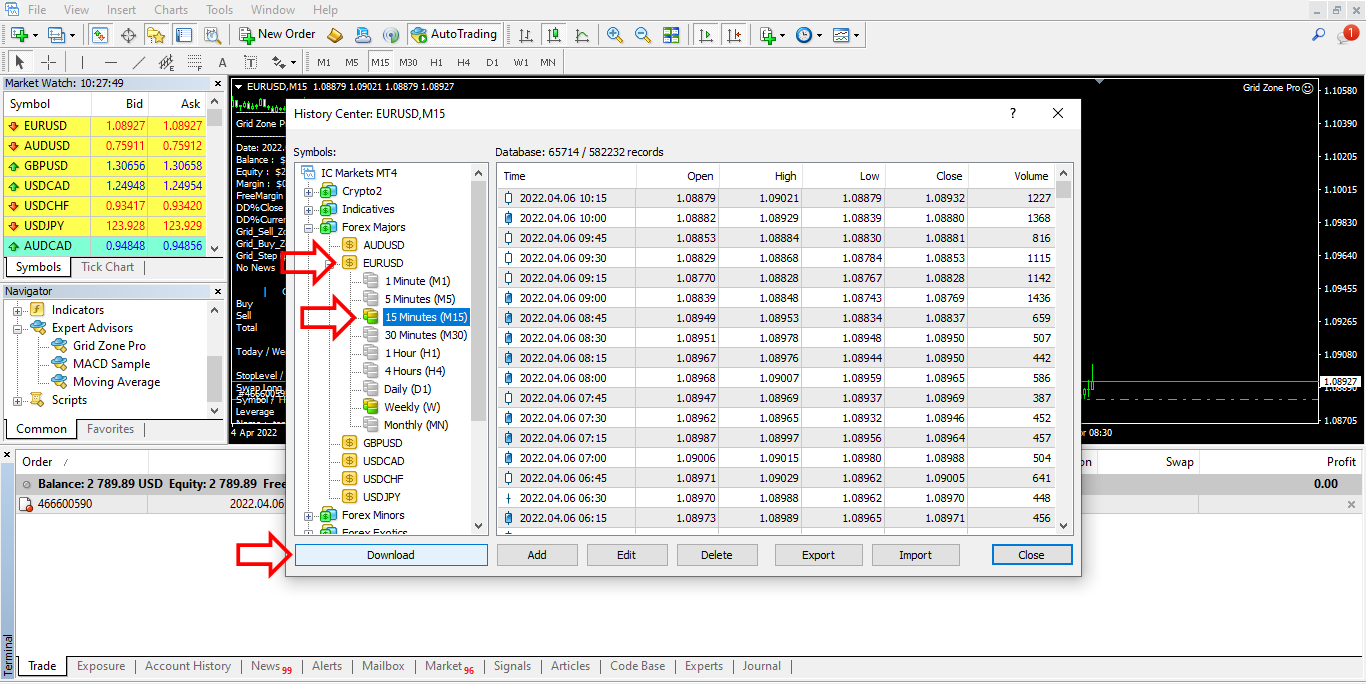 You need to download historical price data as shown in the image. So that the system can create trading zones from historical candlestick history to be used as indicators of trading signals.