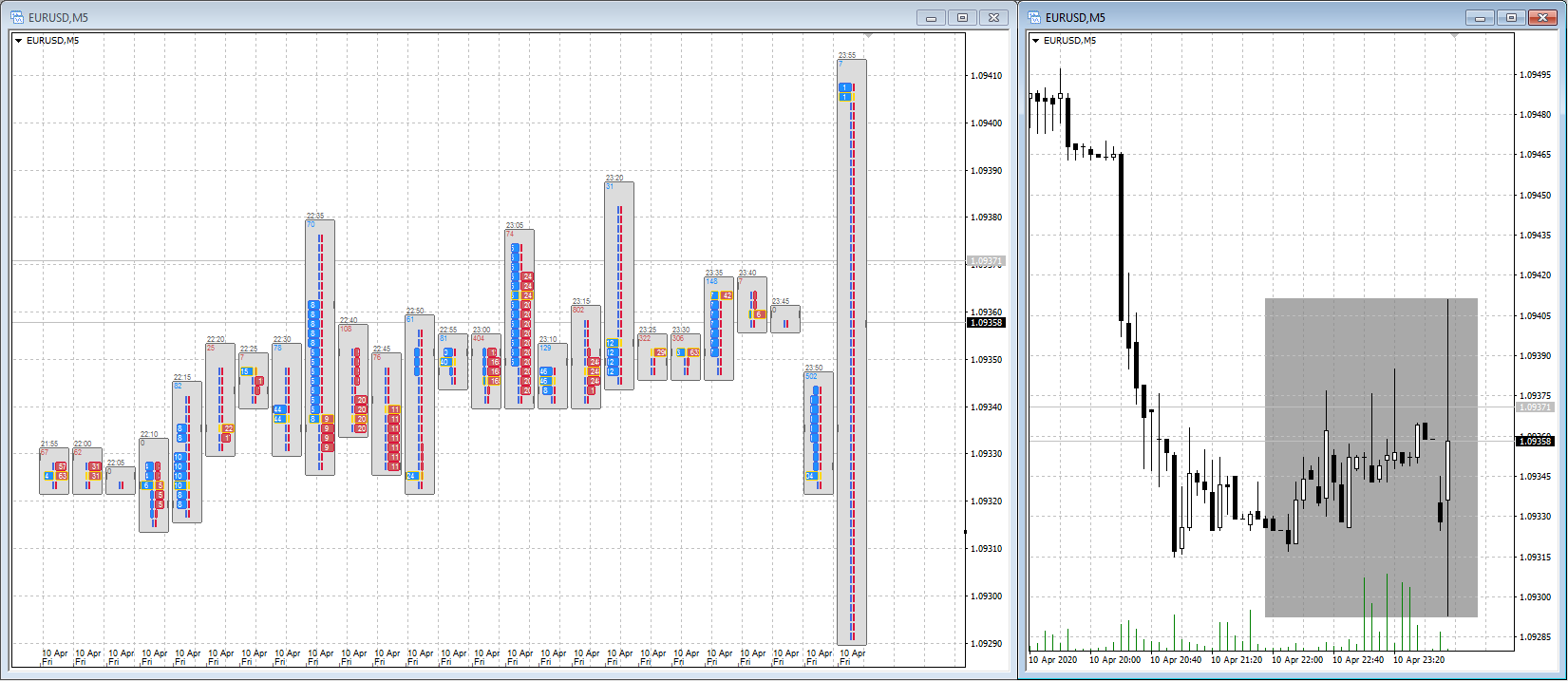 И главная функция индикатора заключается в том, чтобы взять некое количество свечей (обычного графика), заглянуть внутрь каждой этой свечи, вычислить кластерное представление, и соответственно уже отобразить.