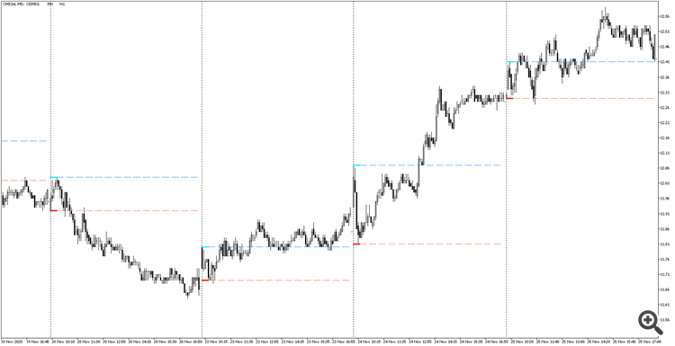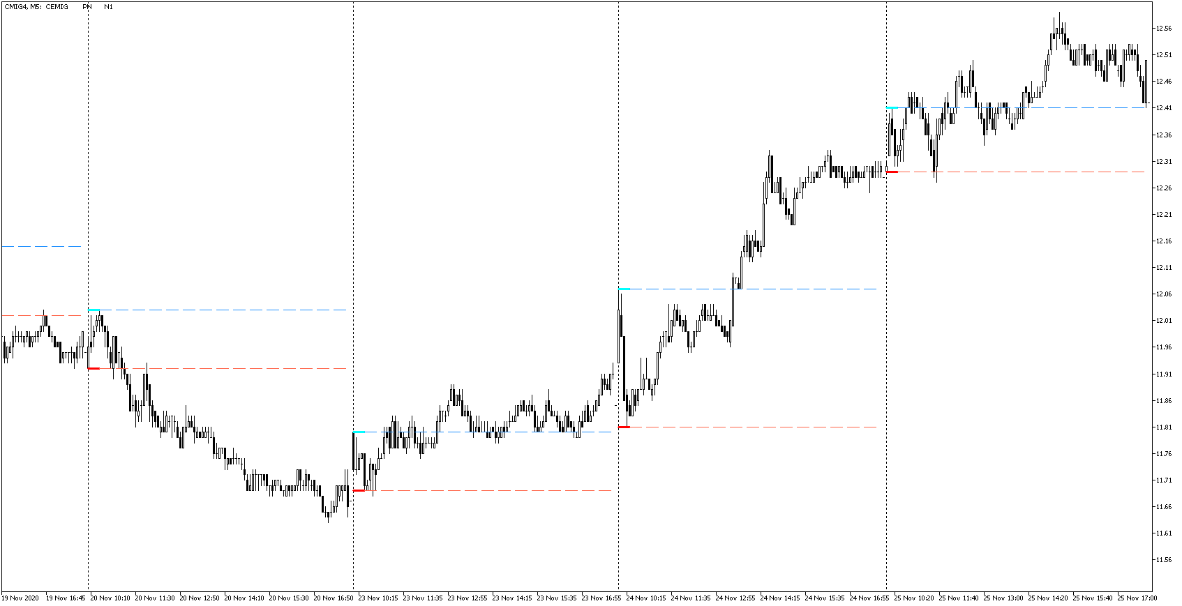 Veja CMIG4,M5....o que acontece ao romper o range dos 30 minutos de pregão (pelo menos eu tenho utilizado o range dos primeiros 30 minutos - no caso do indicador da barra 1 a barra 6 em um gráfico M5).