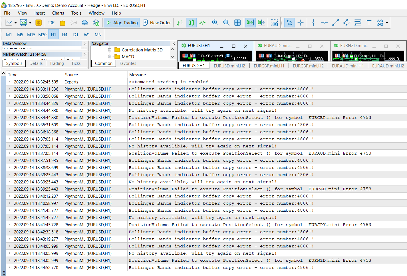Hello Eugene. I just purchased your PhythonML expert advisor and installed it on a demo. The problem is the expert advisor is opening the wrong symbols. For example, instead of EURUSD, it will open EURUSD.mini. In the strategy tester, instead of EURUSD, it will open EURUSD.var. Even when choosing FullEntrySymbolName, the incorrect symbols are still opened. I'm using the broker EnviFX. Could you please correct this bug for that broker? You can see all of the errors in the screenshot.