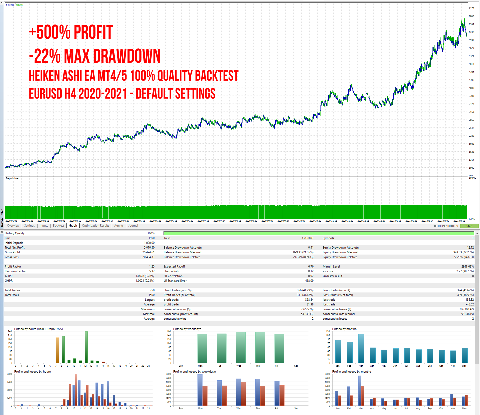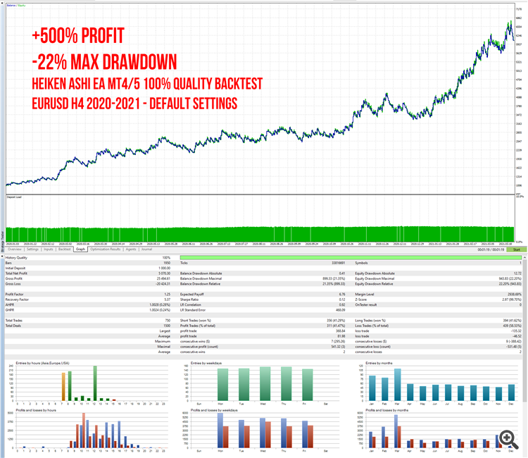 Here is the MT5 100% quality backtest with default settings for EURUSD H4 2020-2021 period.