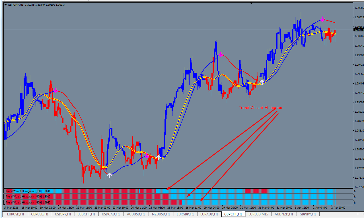 Trend Wizard Histogram is an indicator that shows the strength of a trend of a higher period.