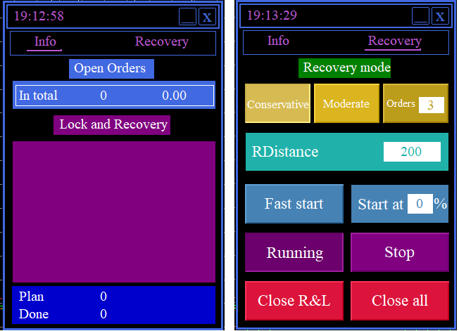 4. Start at % - Once negative floating DrawDown gets to a set % - the recovery system will initiate. After setting the desired % value, user has to press the “Running” button to launch the updates parameters