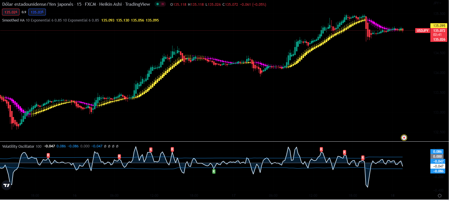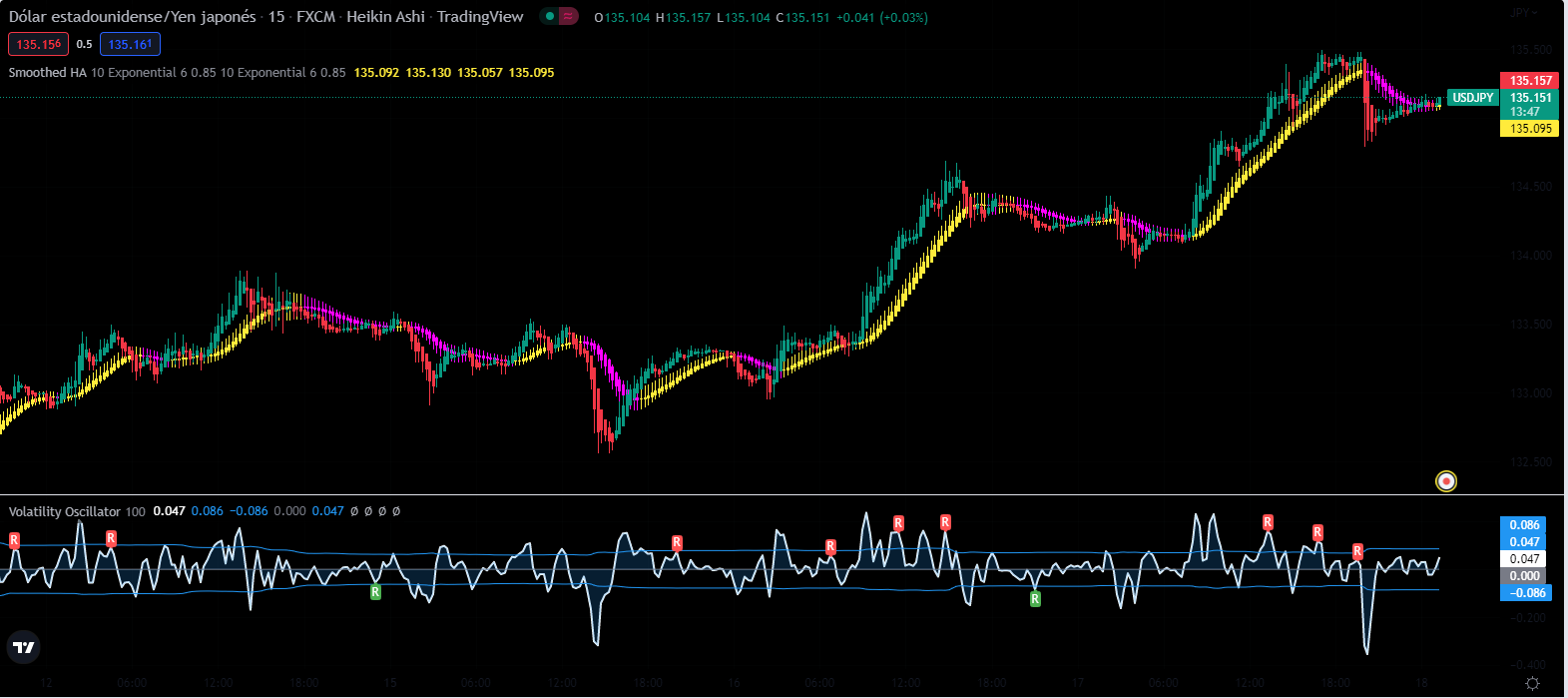 Its very obvious. Price charts show totally different candles. VO Indicator calculated output based on candles. SO here you are. Different recipe = different outcome. ALSO Try not using Heiken Ashi candles but real ones (normal price chart, because metatrader doesn't even have Heiken Ashi chart) And don't you dare to spam anymore.