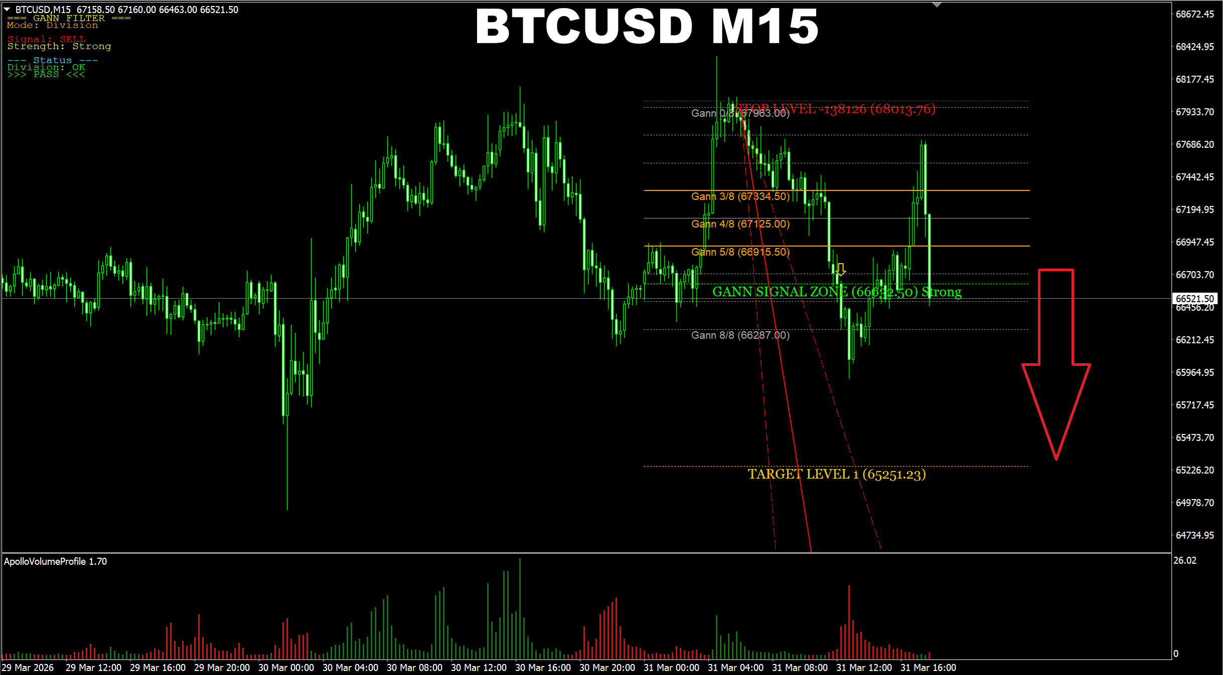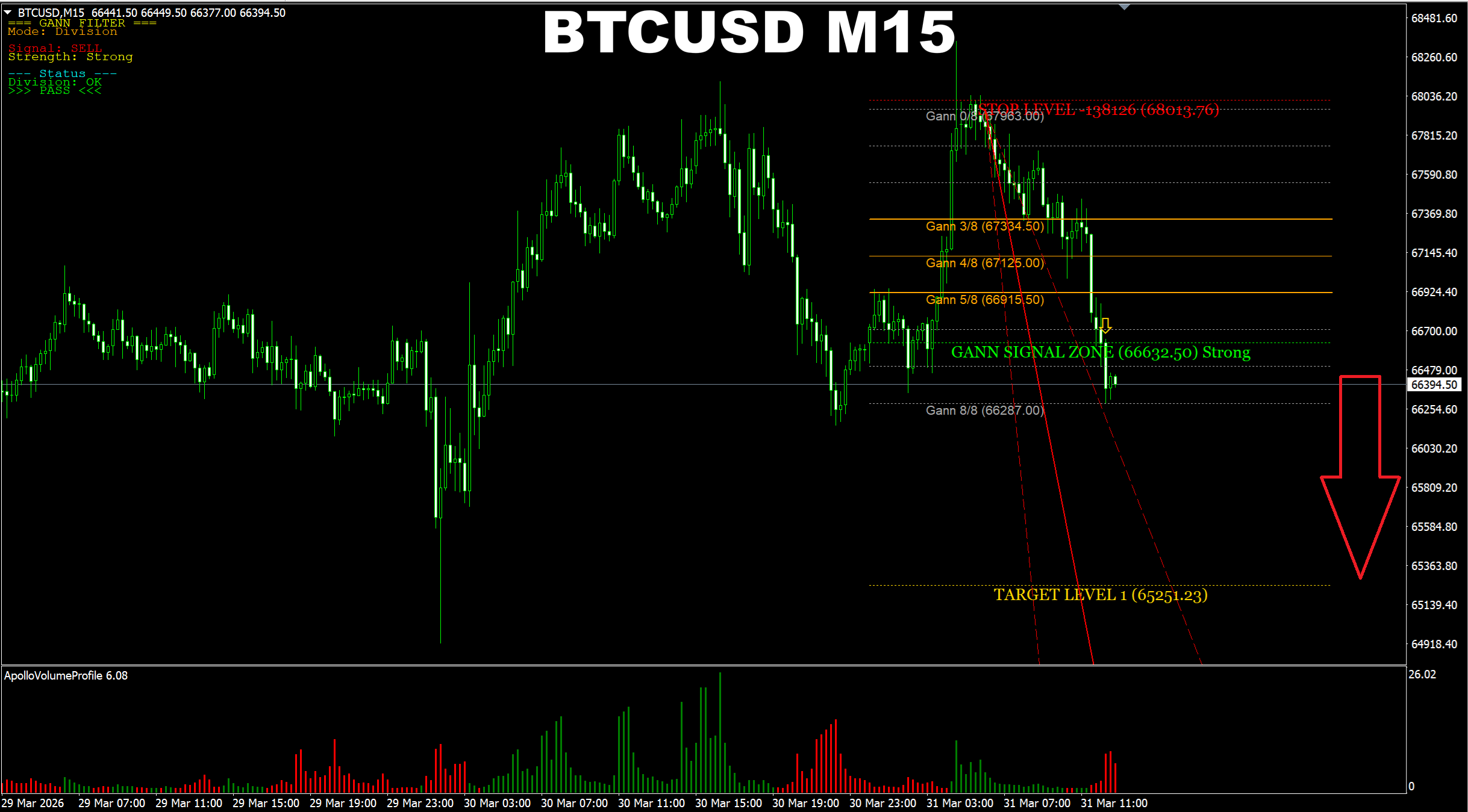 Gann Made Easy. USTEC M15. We have a SELL signal and the price being traded at Support area. I usually recommend waiting for the SR area to be broken before entry. But as the signal is Strong, we may try working with the main target as for now.