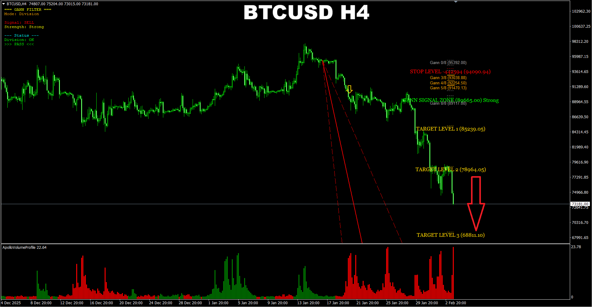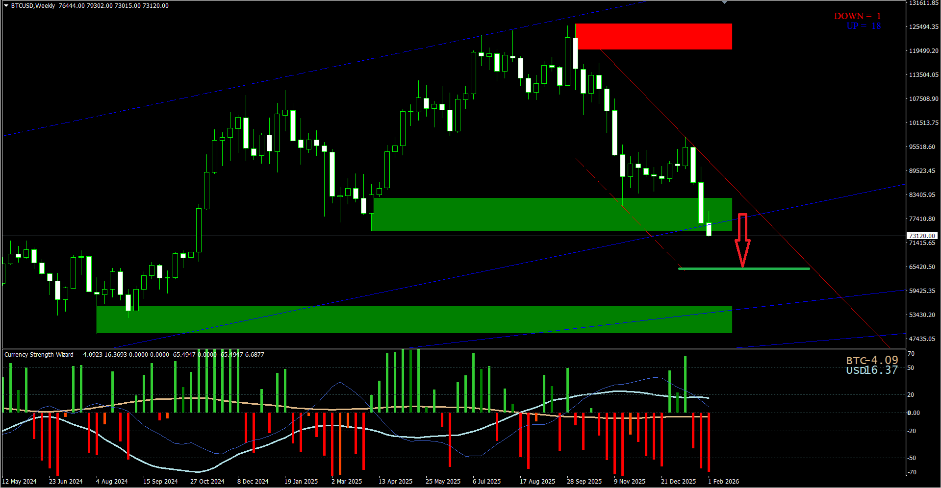 Currency Strength Wizard. BTCUSD W1. Update on my recent post based on the W1 chart analysis. As we see now the price is going lower which means the 65K target is fully confirmed. And this is the area now the price will be heading and eventually will come to.