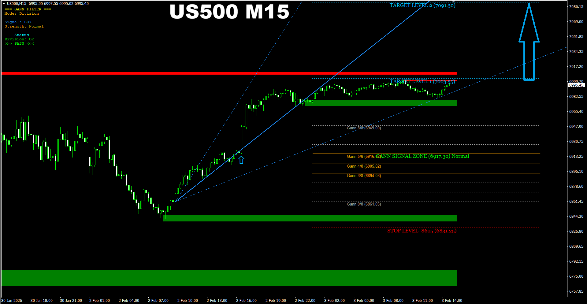 Gann Made Easy. US500 M15. Update on current market. Though we have the TP1 reached already, the price will probably go higher up to the TP2 as there is not any serious Resistance area within this price range.