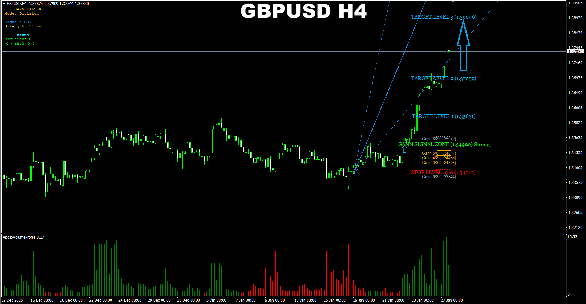 Gann Made Easy. GBPUSD H4. Update on current BUY signal. Price has reached the 2nd target. But it may go higher up to the 1.37800 which is the 3rd TP on the H1 chart.