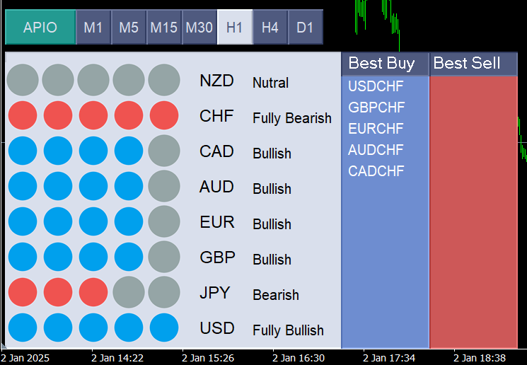 A Power Meter or Currency Meter is a powerful tool designed to analyze the strength of individual currencies by monitoring their movements across various currency pairs. For example, it can determine whether the USD is currently bullish, semi-bullish, or fully bullish, or if the JPY is bearish, semi-bearish, or fully bearish.