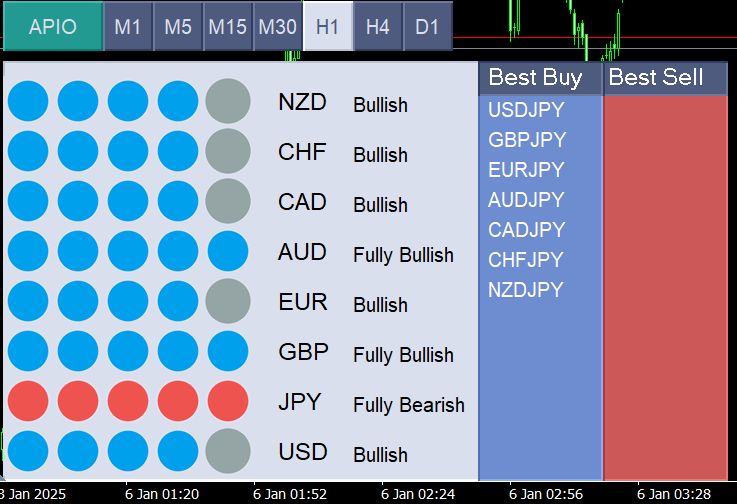 현재 제품 가격은 49달러로 제한된 시간 동안 제공됩니다. 다음 가격은 99달러가 될 것입니다. All Power In One (APIO) 지표 All Power In One (APIO) 는 USD, EUR, GBP와 같은 주요 통화의 강도를 평가하는 강력한 도구입니다. 여러 통화쌍의 움직임과 방향을 선택한 시간대에서 분석함으로써 APIO는 통화의 강도와 잠재적인 거래 기회를 명확하게 제공합니다. APIO의 MT5 버전이 제공됩니다. 아래 링크를 통해 MT5 버전을 확인하십시오: https ://www .mql5 .com /en /market /product /129241 이 지표를 사용하여 무엇을 얻을 수 있나요? 각 통화의 실시간 강도: USD, EUR, GBP 등과 같은 통화의 실시간 강도를 추적하세요. 최고의 매수 기회 목록: 매수 거래에 가장 적합한 통화쌍 목록을 받으세요. 최고의 매도 기회 목록: 매도 거래에 가장 적합한 통화쌍 목록을