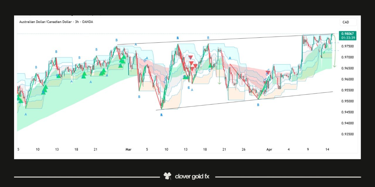 AUDCAD on the three hour timeframe is printing a mature ascending channel with a clean five wave structure pushing into the upper boundary, suggesting the move is running out of momentum. The repeated taps into resistance combined with increasingly shallow pullbacks reflect exhaustion rather than strength, while the internal swings show a loss of impulsive behavior and more corrective overlap. This type of structure often precedes a liquidity sweep above the highs followed by a sharp rejection, trapping late buyers at the top. A failure to sustain above the channel resistance would likely trigger a rotation back toward the lower boundary, with downside expansion as sell-side pressure returns. The bias shifts cautiously bearish at this stage, with confirmation dependent on rejection and breakdown structure rather than blind anticipation.