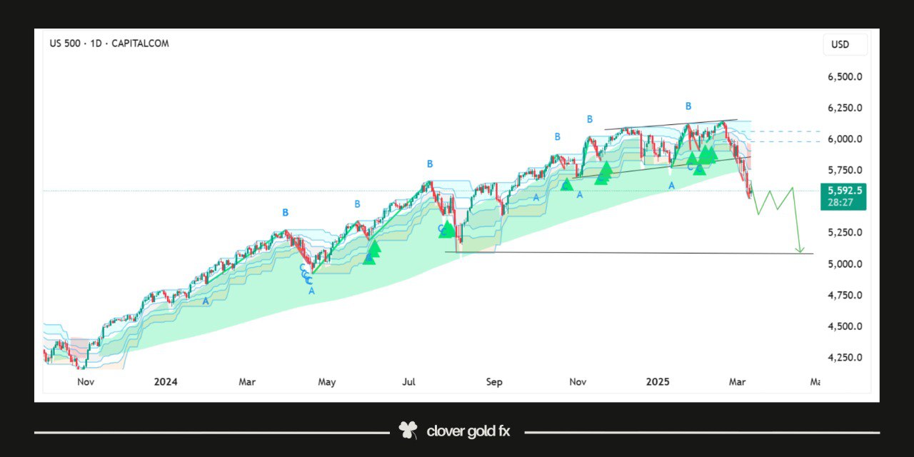 The S&P 500 (US500) has confirmed a bearish breakdown of a key daily support level, signaling potential for further downside. With sellers in control and momentum shifting lower, the next critical support zone to watch is around 5200–5000 aligning with previous demand areas and key moving averages. A clean rejection of this level could accelerate the sell-off toward deeper liquidity zones. Unless bulls reclaim the lost support as a new floor, the bias remains bearish, with a possible continuation toward the next structural pivot.
