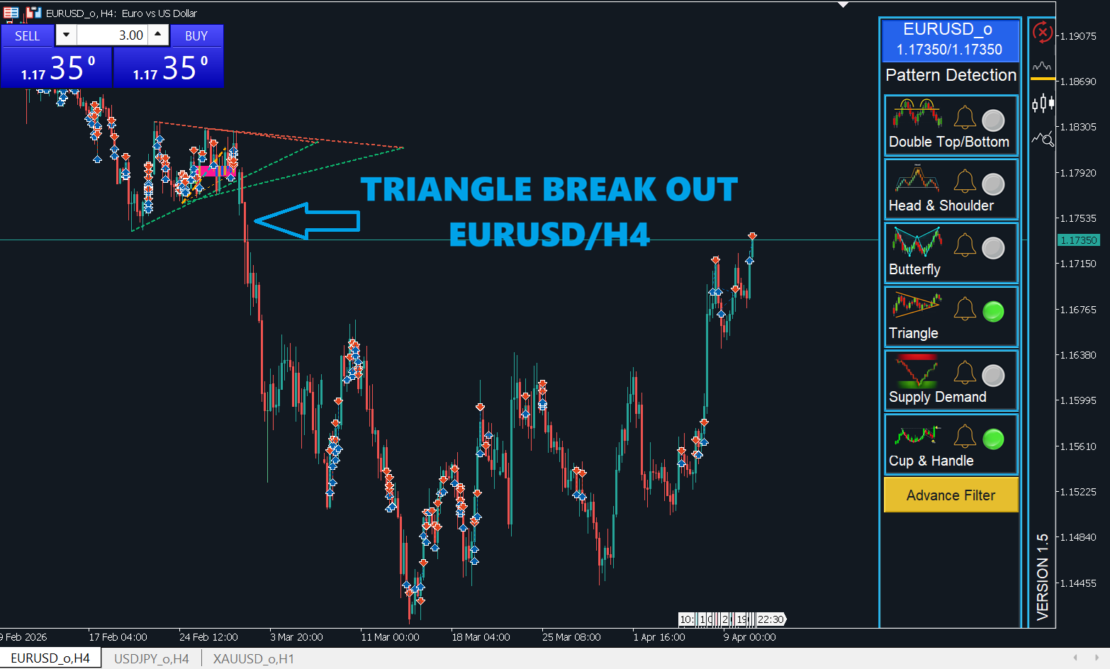 **TRIANGLE BREAK OUT SIGNAL DETECTED ON EURUSD/H4 BY STRATEGY ASSISTANT**