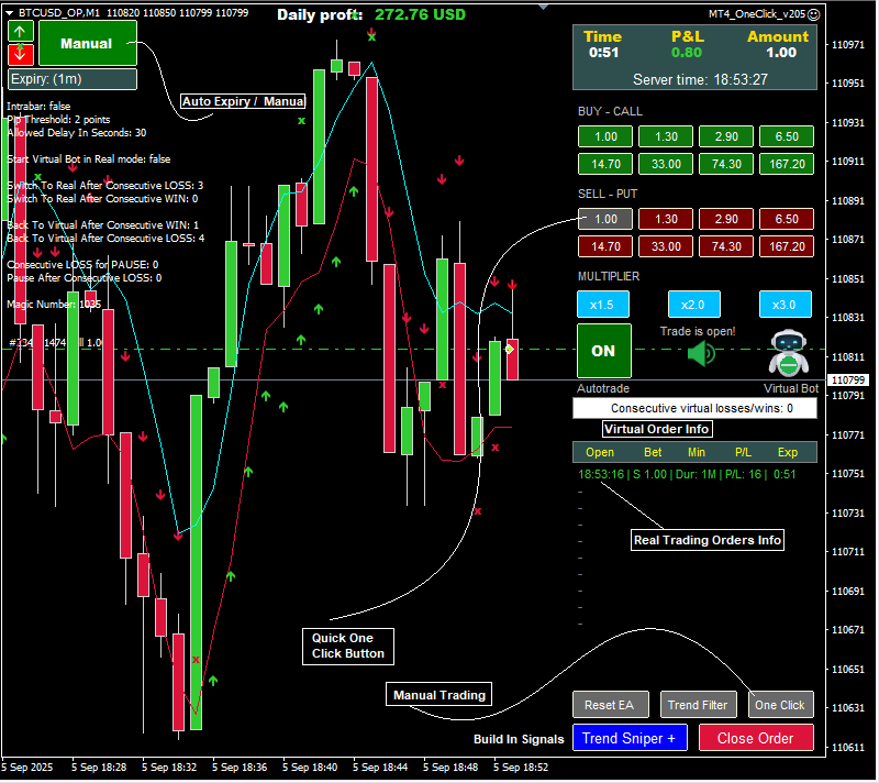✅ Built-in trading signals + quick action buttons for manual entries in auto-trading mode