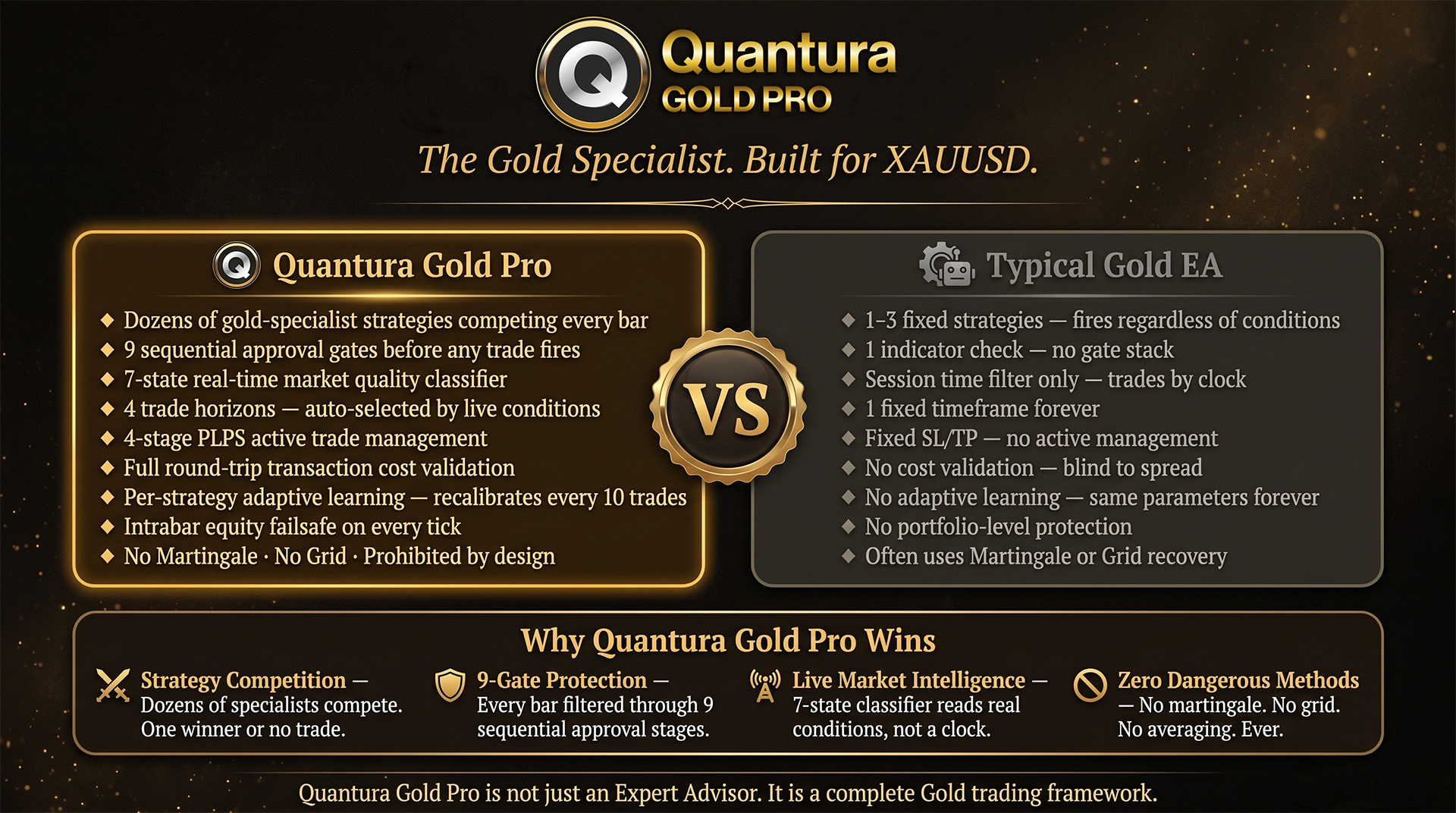 ⚡ LAUNCH PRICE: $599 — First 50 Licenses Only. Next Price: $799. Permanent. No Exceptions, No Rollbacks. DOCUMENTATION INCLUDED: Every license includes the complete User Guide, deployment playbooks, and priority support access. Sent privately via MQL5 message after purchase. Not a signal generator. A decision engine — built exclusively for Gold. Quantura Gold Pro is not a typical retail trading robot. It is a structured, multi-strategy decision engine designed to operate only under favourable