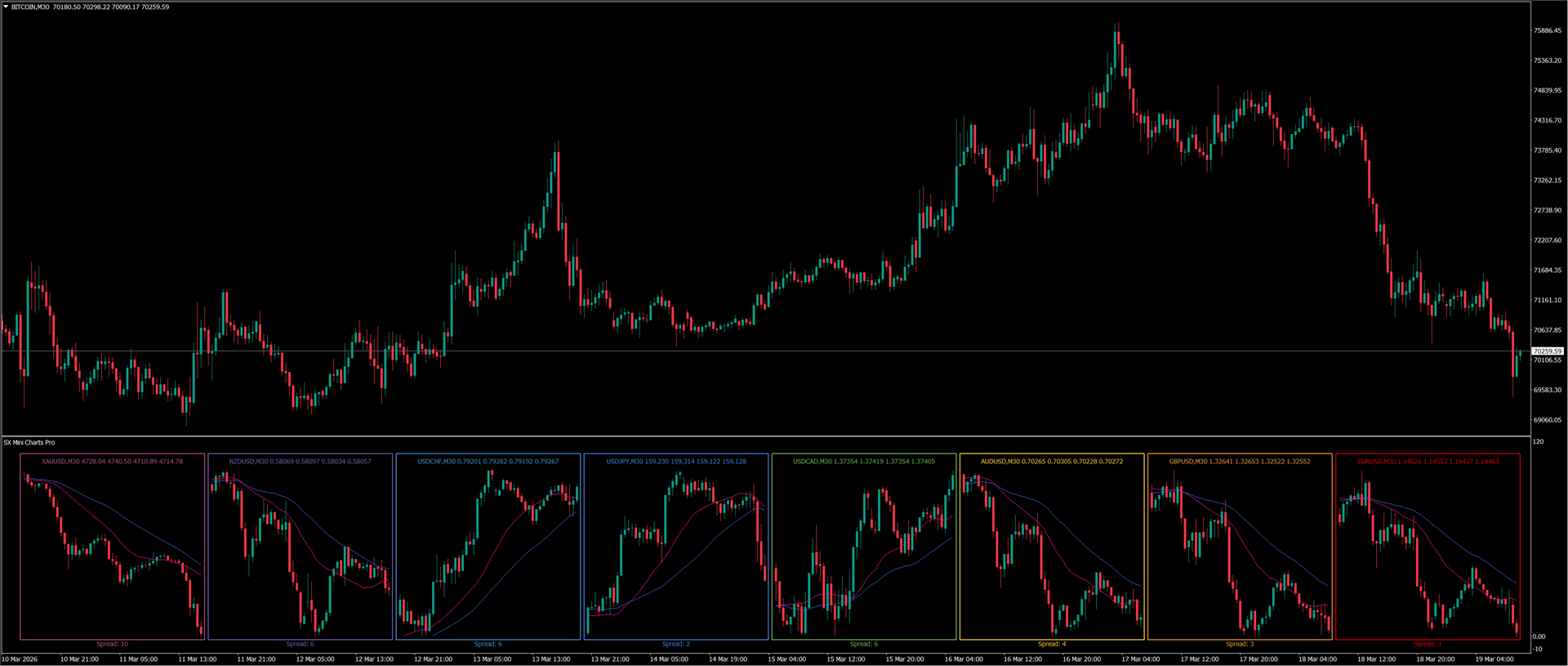 8 mini-charts with Heiken Ashi and MA, perfectly synced with your main timeframe for fast and focused market analysis.