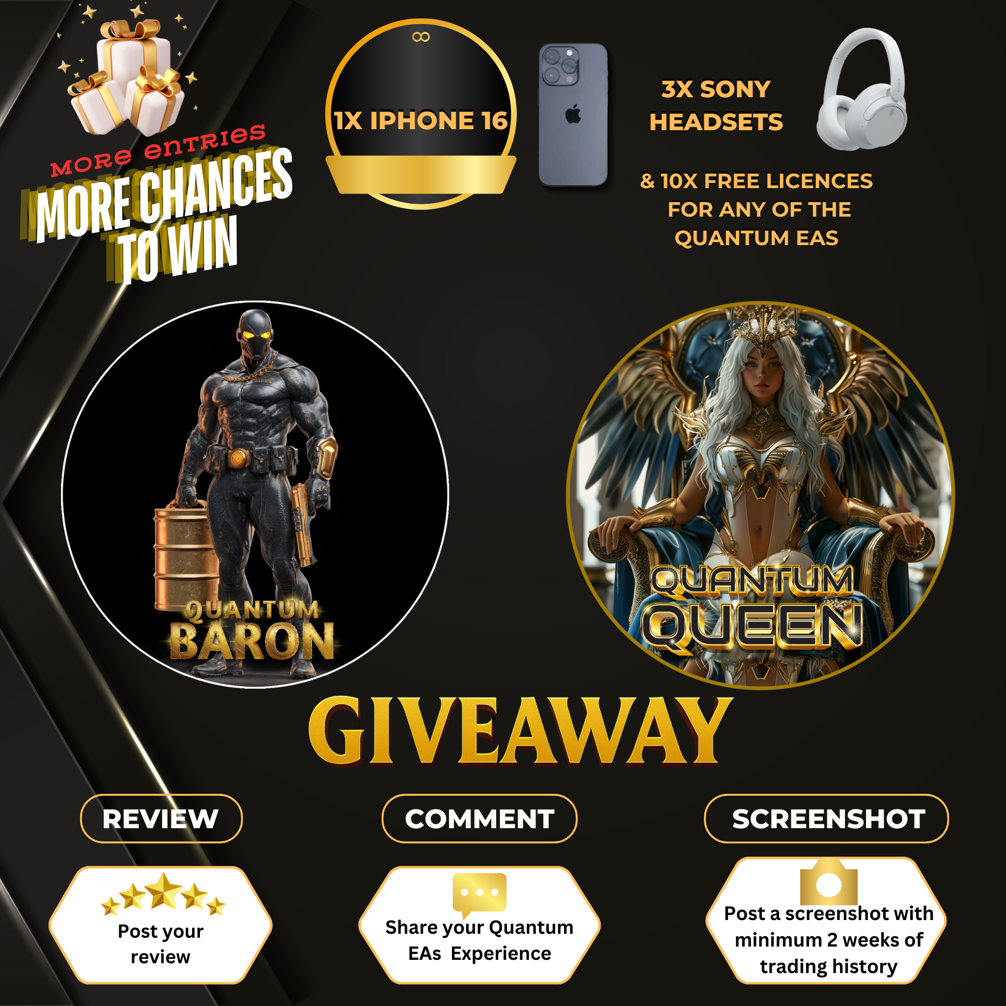 To celebrate the incredible success of Quantum Baron and Quantum Queen – the top two best-performing EAs in the Quantum lineup – I’m thrilled to announce a brand new Giveaway Contest! This is your chance to win BIG while sharing your journey with the Quantum family. 💎✨