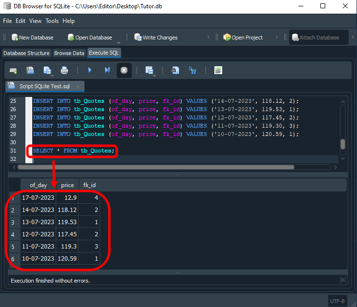 01. PRAGMA FOREIGN_KEYS = ON; 02. 03. DROP TABLE IF EXISTS tb_Quotes; 04. DROP TABLE IF EXISTS tb_Symbols; 05. 06. CREATE TABLE IF NOT EXISTS tb_Symbols 07. ( 08. id INTEGER PRIMARY KEY, 09. symbol TEXT NOT NULL UNIQUE 10. ); 11. 12. CREATE TABLE IF NOT EXISTS tb_Quotes 13. ( 14. of_day TEXT NOT NULL, 15. price NUMERIC NOT NULL, 16. fk_id INTEGER NOT NULL, 17. FOREIGN KEY (fk_id) REFERENCES tb_Symbols(id) 18. ); 19. 20. INSERT INTO tb_Symbols (id, symbol) VALUES(1, 'BOVA11'); 21. INSERT INTO tb_Symbols (id, symbol) VALUES(3, 'PETR4'); 22. INSERT INTO tb_Symbols (id, symbol) VALUES(2, 'WDOQ23'); 23. INSERT INTO tb_Symbols (id, symbol) VALUES(4, 'VALE3'); 24. INSERT INTO tb_Quotes (of_day, price, fk_id) VALUES ('17-07-2023', 12.90, 4); 25. INSERT INTO tb_Quotes (of_day, price, fk_id) VALUES ('14-07-2023', 118.12, 2); 26. INSERT INTO tb_Quotes (of_day, price, fk_id) VALUES ('13-07-2023', 119.53, 1); 27. INSERT INTO tb_Quotes (of_day, price, fk_id) VALUES ('12-07-2023', 117.45, 2); 28. INSERT INTO tb_Quotes (of_day, price, fk_id) VALUES ('11-07-2023', 119.30, 3); 29. INSERT INTO tb_Quotes (of_day, price, fk_id) VALUES ('10-07-2023', 120.59, 1); 30. 31. SELECT * 32. FROM tb_Quotes AS tq, tb_Symbols AS ts 33. WHERE tq.fk_id = ts.id;