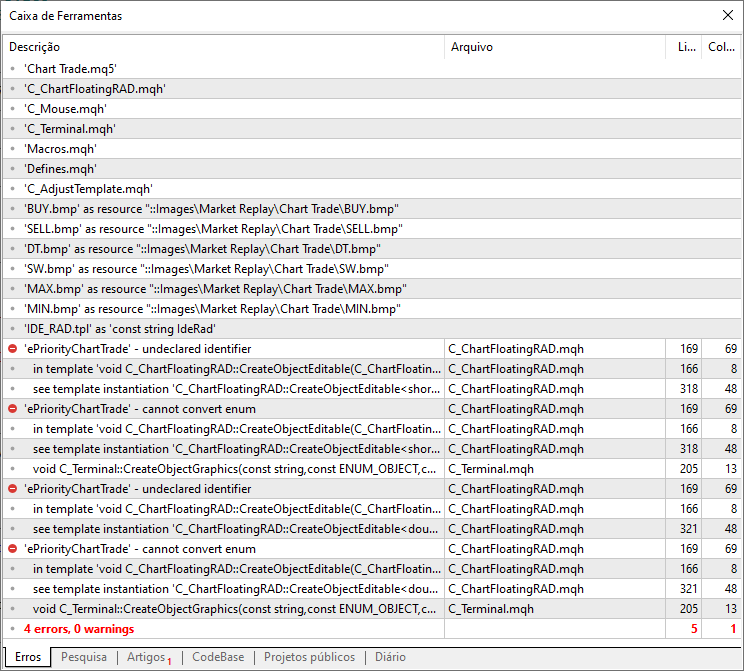 Note que agora temos menos tipos de enumeração em EnumPriority. Com isto, agora temos o tipo padrão, ou default, que é o zero. E temos um outro que é o ePriorityNull. Este deverá ser usado em todos os objetos que não deverão de maneira alguma receber alguma interação. Pois bem, feito esta mudança, teremos de fazer uma nova compilação de todo o nosso código. Isto para garantir que ele permaneça completamente estável. Ao tentarmos compilar o indicador Chart Trade, é gerado alguns erros vindos da classe C_ChartFloatingRAD. Eles podem ser visualizados na imagem abaixo.