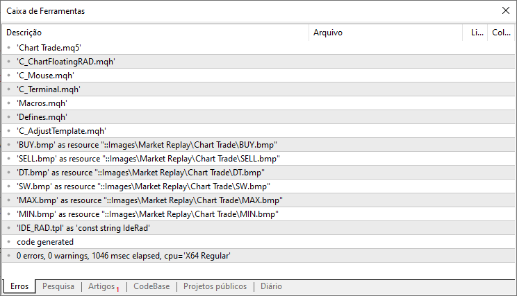 Efetuada a mudança, tentamos novamente compilar o indicador Chart Trade. E com isto, o resultado é visto logo abaixo.