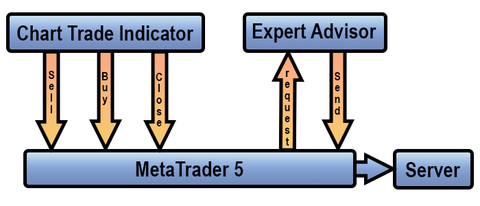 Por consequência o MetaTrader 5, irá disparar um evento OnChartEvent. Porém este será do tipo customizado. Assim, o Expert Advisor conseguirá captura o requerimento feito pelo usuário ao chart Trade. Logo que este requerimento for devidamente interpretado, ele disparará um novo evento. Este irá ser direcionado ao servidor de negociação. Fazendo com que uma posição seja aberta, fechada ou tenha o volume modificado.