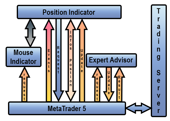 Este fluxo mostrado acima, acontece em diversos momentos. Quando algum requerimento é enviado ao servidor. Mas note que temos uma seta ROXA neste diagrama. Esta seta, é justamente a responsável por indicar que o Expert Advisor estará criando o indicador de posição. Está é uma parte em que outras aplicações não ficaram cientes do que está acontecendo. Mas assim que o indicador já esteja no gráfico. O Expert Advisor envia um evento customizado para o MetaTrader 5. Este será redirecionado ao gráfico, e será capturado pelo indicador de posição. Fazendo com que ele capture os dados mais atuais presentes na posição.