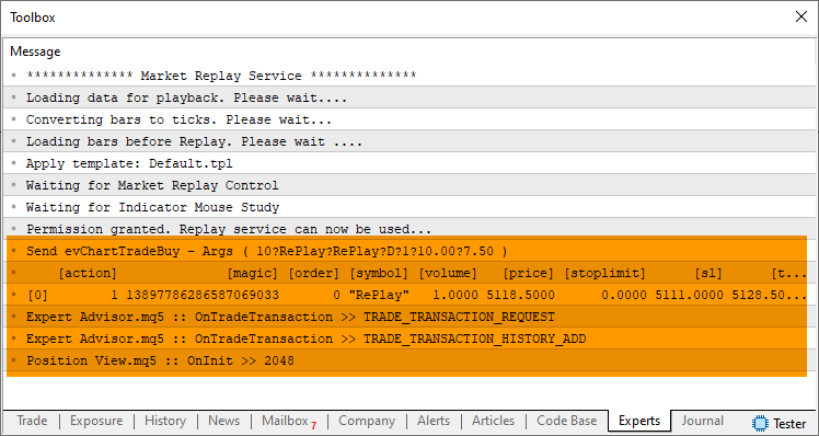 Observe que estamos mudando, levemente, o código visto no artigo anterior. Agora preste atenção. Existem dois pontos, onde um novo código irá ser injetado do Expert Advisor. Estes pontos podem ser vistos no fragmento, nas linhas 60 e 123. Para que você consiga entender. Na linha 60, iremos colocar um código cujo objetivo é colocar o indicador de posição no gráfico. Isto seria o equivalente ao que é feito entre as linhas 46 e 57. E na linha 123, faremos o equivalente ao código entre as linhas 115 e 119. Ou seja, o Expert Advisor sofrerá poucas mudanças. Já o código em OnTradeTransaction, não sofrerá nenhuma mudança, conforme foi explicado no artigo anterior. Porém ele será bastante utilizado aqui no Expert Advisor. Mesmo quando estivermos usando o Expert Advisor no replay/simulador. Mas não se preocupe. Irei explicar em detalhes como isto será de fato feito.