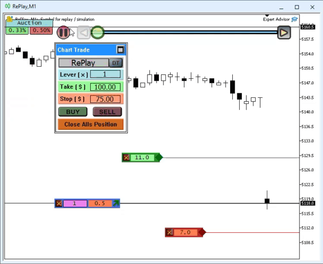 Note que praticamente temos a mesma forma de trabalhar, como se estivéssemos em contato com o servidor real. Porém, neste exato momento, apenas estamos abrindo a posição. Não temos de forma alguma o seu fechamento, caso a linha de take profit ou stop loss, venham a ser atingidas. Se quer temos o fechamento da posição caso venhamos a clicar no botão de fechar. Mas todo o restante, está funcionando de forma perfeita e como esperado. Mas este sistema ainda precisa ser melhorado. Lembre-se este foi apenas o primeiro teste. Não estamos ainda fazendo nada de tão grandioso. Mas se você deixar o fragmento como mostrado. Você poderá simular uma conta HEDGING mesmo que o ativo seja para conta NETTING. Então temos algo sendo implementado, mesmo antes de tentarmos implementar isto de fato.