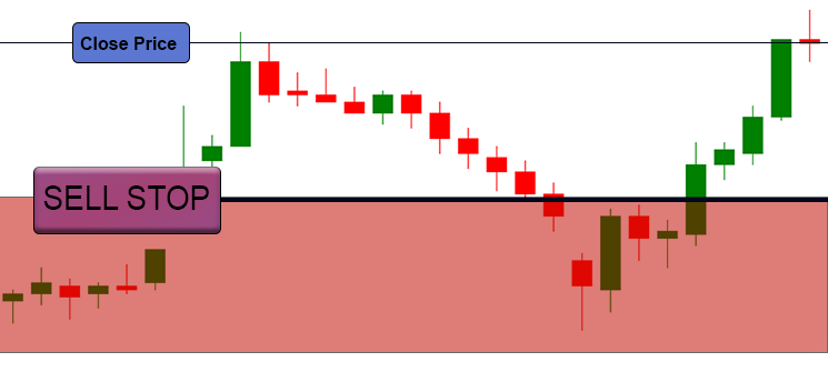 Neste caso estamos fazendo uma venda, caso o preço de fechamento caia abaixo do ponto indicado. Neste caso o código de disparo, será o mesmo visto anteriormente. A única diferença será que no lugar de uma compra a mercado, você fará uma venda a mercado. Assim podemos ver a próxima figura, esta é vista em seguida.