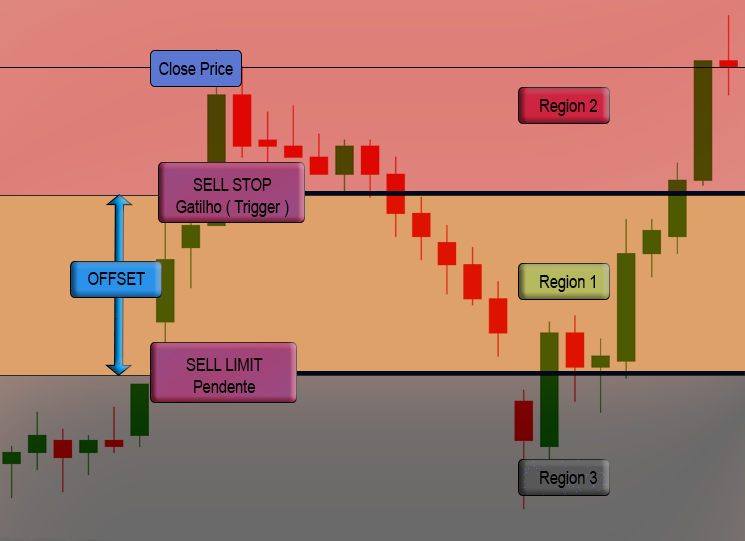 Ambas imagem representam como é estruturada uma ordem BUY STOP LIMIT e SELL STOP LIMIT, isto pelo ponto de vista do servidor. Tanto que se você colocar este tipo de ordem no gráfico do MetaTrader 5, verá que aparecerá não três, mas quatro linhas. Mas por que? O motivo é que três das quatro linhas de fato representa uma das ordens vista no tópico anterior. A quarta linha que aparece no gráfico, neste tipo de ordem, representa o gatilho. Este fará com que um dos quatro tipos vistos no tópico anterior venham a surgir, podendo ou não vir a ser executadas imediatamente. E é aqui que mora o tal do OFFSET.