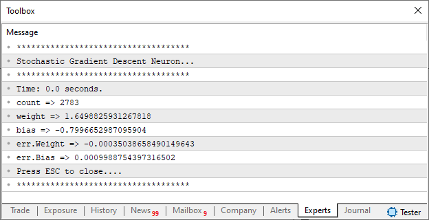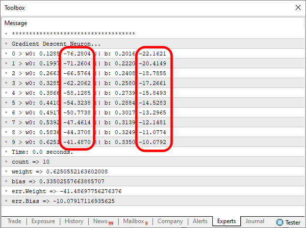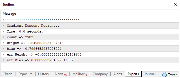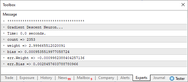 . //+------------------------------------------------------------------+ 07. double Train[][2] { 08. {0, -0.8}, 09. {1, 0.85}, 10. {2, 2.5}, 11. {3, 4.15}, 12. {4, 5.8}, 13. }; 14. //+------------------------------------------------------------------+ . . . 41. //+------------------------------------------------------------------+ 42. void OnStart() 43. { . . . 55. for(count = 0; count < 10; count++) 56. { 57. err = Cost(weight, bias); 58. if ((MathAbs(err.Weight) <= epsilon) && (MathAbs(err.Bias) <= epsilon)) 59. break; 60. weight -= (err.Weight * epsilon); 61. bias -= (err.Bias * epsilon); 62. PrintFormat("%I64u > w0: %.4f %.4f || b: %.4f %.4f", count, weight, err.Weight, bias, err.Bias); 63. }