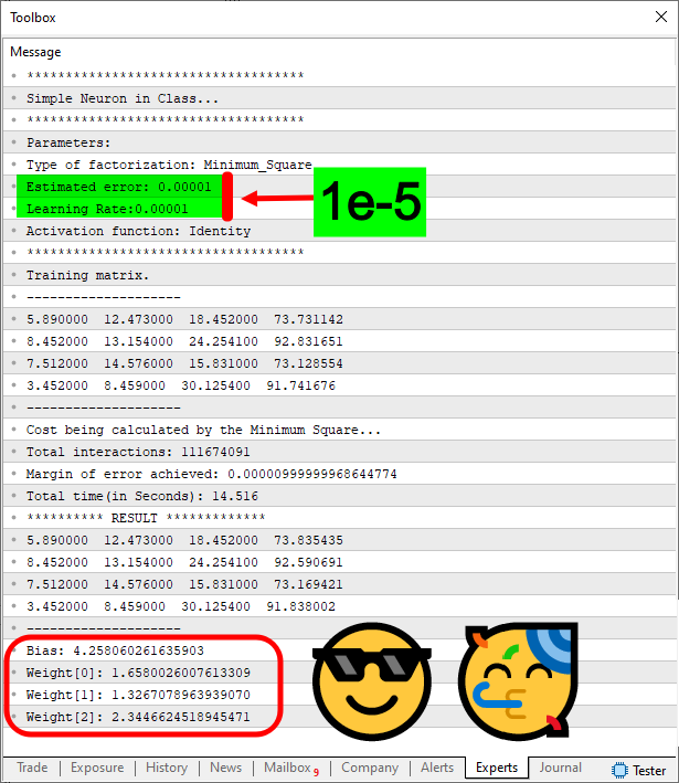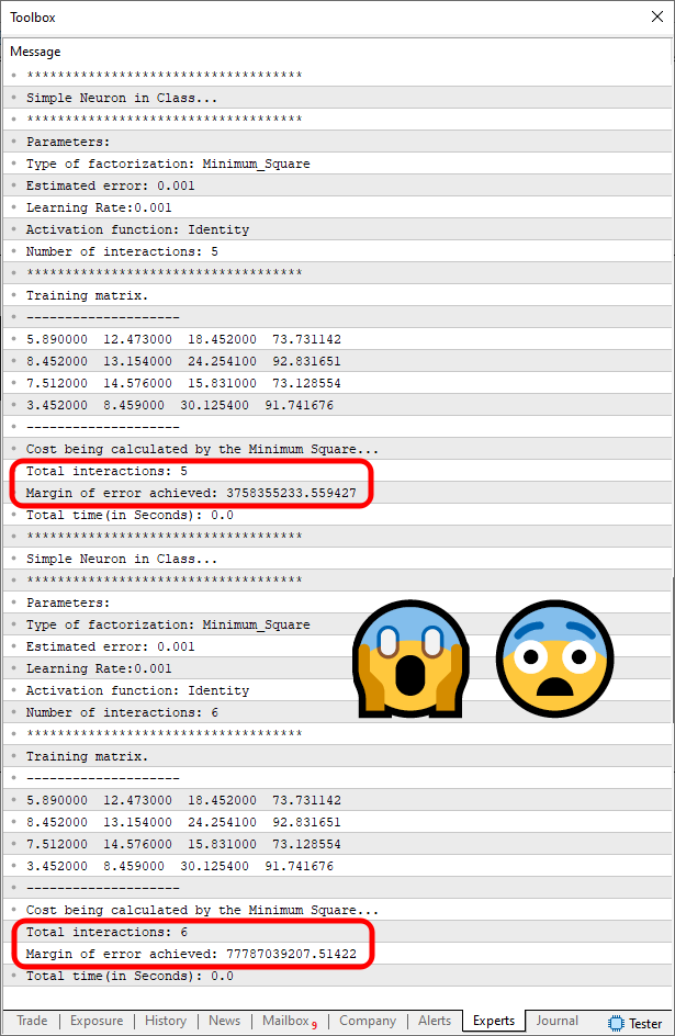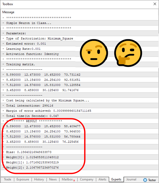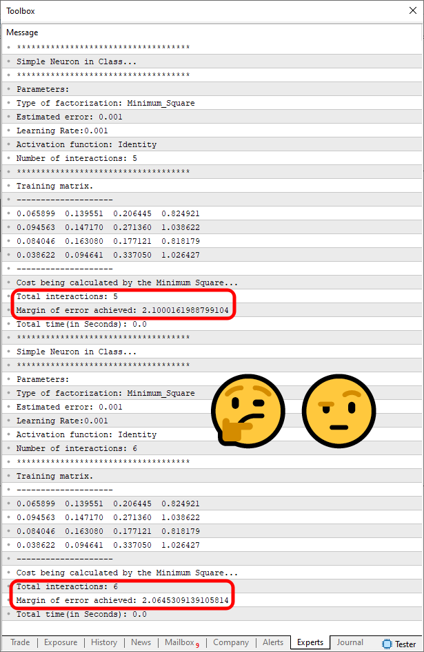 Observe que além do array de treinamento, que se encontra modificado. Também existe a presença da linha dezenove. Esta será responsável por nos ajudar a configurar o número de interações que o código fará. Por motivos práticos, a linha cinquenta e dois, que é a responsável por apresentar os resultados, foi comentada, assim ela não será mais executada. Contudo, isto pouco importa, já que precisamos de fato é da linha cinquenta e um seja executada. Já que ela irá nos mostra qual o erro que o perceptron está tendo naquele exato número de interações. Agora veja o que acontece, quando executamos este código no terminal do MetaTrader 5. O resultado é visto na imagem abaixo.