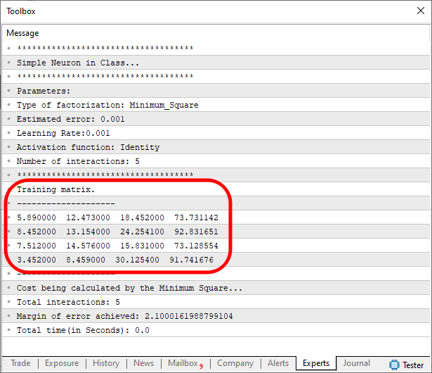 //+------------------------------------------------------------------+ void Performs_Training(double epsilon, double LearningRate, ulong limit) { ulong it0, it1; it0 = GetTickCount(); Print("Margin of error achieved: ", Learning(m_arr, m_Limits.Reason, epsilon, LearningRate, limit)); it1 = GetTickCount(); Print("Total time(in Seconds): ", (it1 - it0) / 1000.0); } //+------------------------------------------------------------------+
