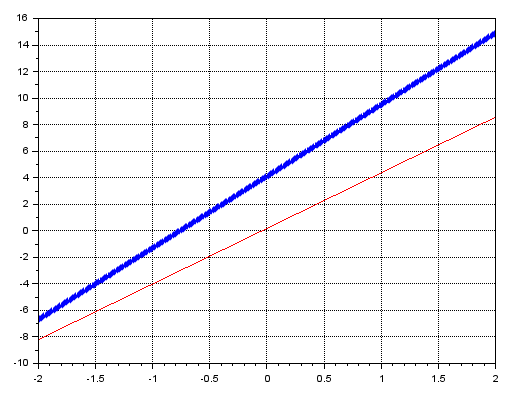 clc; clear; clf; x = [-2:0.01:2]; y = (1.8 * x) + (1.254 * x) + (2.35 * x) + 4.1258; plot(x, y, 'p-'); y = (1.0154853811048012 * x) + (1.0716921538608219 * x) + (2.1067987234970276 * x) + 0.18640216948633873; plot(x, y, 'r-'); xgrid(0, 1);