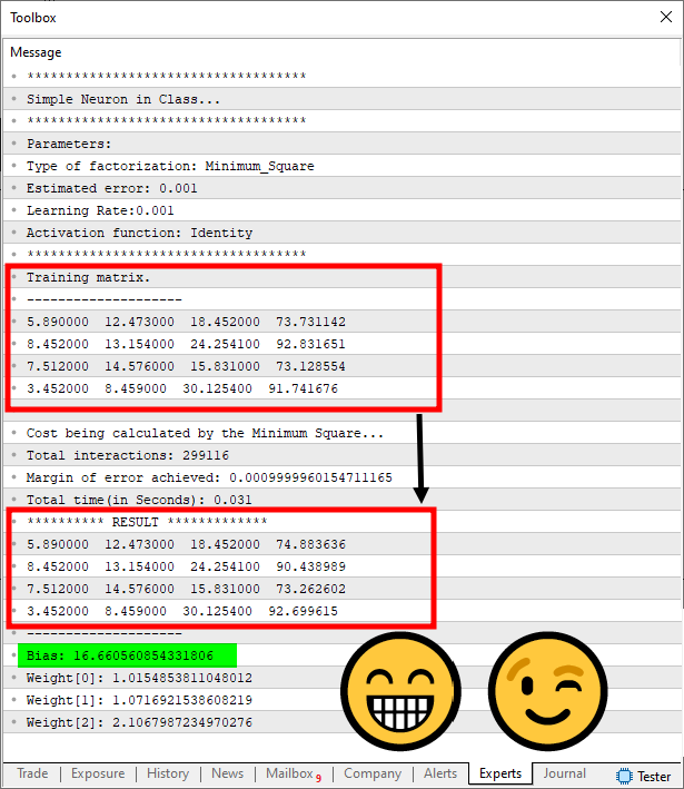 //+------------------------------------------------------------------+ void OnStart() { C_Check_Neuron *neuron; Print("************************************"); Print("Simple Neuron in Class..."); Print("************************************"); Print("Parameters:"); Print("Type of factorization: ", EnumToString(user00)); Print("Estimated error: ", user01); Print("Learning Rate:", user02); Print("Activation function: ", EnumToString(user03)); Print("************************************"); neuron = new C_Check_Neuron(Train, nColumns - 1, user03, user00 == Minimum_Square); (*neuron).View_Training_Data(); (*neuron).Performs_Training(user01, user02, ULONG_MAX); (*neuron).Check_Training(Train); delete neuron; } //+------------------------------------------------------------------+