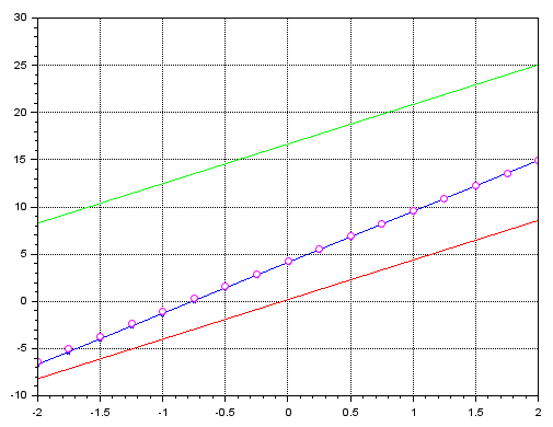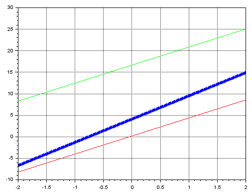 clc; clear; clf; x = [-2:0.01:2]; y = (1.8 * x) + (1.254 * x) + (2.35 * x) + 4.1258; plot(x, y, 'p-'); y = (1.0154853811048012 * x) + (1.0716921538608219 * x) + (2.1067987234970276 * x) + 0.18640216948633873; plot(x, y, 'r-'); y = (1.0154853811048012 * x) + (1.0716921538608219 * x) + (2.1067987234970276 * x) + 16.660560854331806; plot(x, y, 'g-'); xgrid(0, 1);