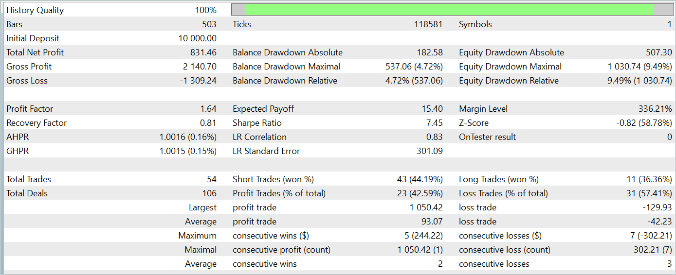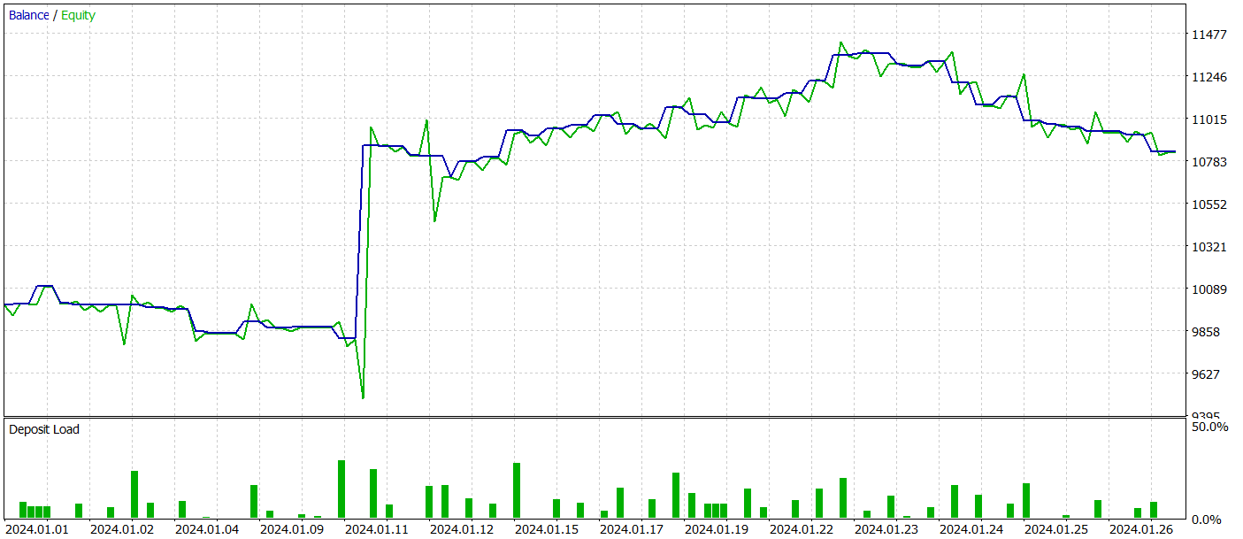 Lembro que o treinamento foi realizado com dados históricos do par EURUSD no intervalo de tempo H1 para o ano de 2023. Os parâmetros de todos os indicadores permaneceram os mesmos.
