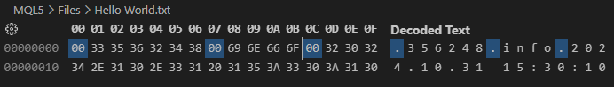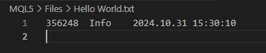 01. //+------------------------------------------------------------------+ 02. #property copyright "Daniel Jose" 03. //+------------------------------------------------------------------+ 04. void OnStart(void) 05. { 06. int handle; 07. ulong old; 08. 09. const datetime dt = D'31.10.2024 15:30:10'; 10. const int i32 = 356248; 11. 12. if ((handle = FileOpen("Hello World.txt", FILE_WRITE | FILE_READ | FILE_ANSI | FILE_BIN)) == INVALID_HANDLE) 13. { 14. Print("Error..."); 15. return; 16. }; 17. FileWriteInteger(handle, 0, CHAR_VALUE); 18. FileWriteString(handle, (string)i32); 19. FileWriteInteger(handle, 0, CHAR_VALUE); 20. FileWriteString(handle, "info"); 21. FileWriteInteger(handle, 0, CHAR_VALUE); 22. FileWriteString(handle, StringFormat("%s", TimeToString(dt, TIME_DATE | TIME_SECONDS))); 23. 24. FileFlush(handle); 25. 26. FileSeek(handle, 0, SEEK_SET); 27. while (!FileIsEnding(handle)) 28. { 29. old = FileTell(handle); 30. Print(FileTell(handle) - old, " || ", FileTell(handle), " >> ", FileReadString(handle)); 31. } 32. 33. FileClose(handle); 34. } 35. //+------------------------------------------------------------------+