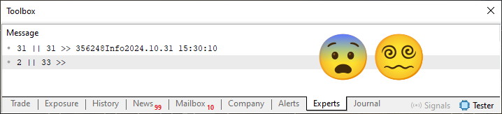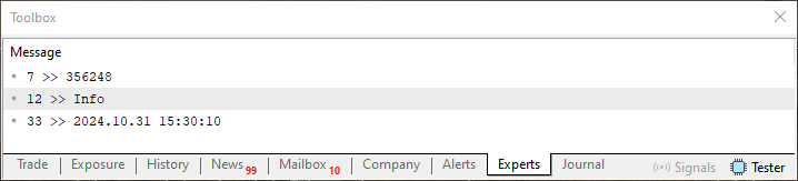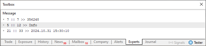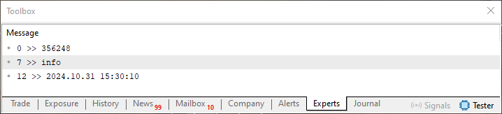 01. //+------------------------------------------------------------------+ 02. #property copyright "Daniel Jose" 03. //+------------------------------------------------------------------+ 04. void OnStart(void) 05. { 06. int handle; 07. ulong old; 08. 09. const datetime dt = D'31.10.2024 15:30:10'; 10. const int i32 = 356248; 11. 12. if ((handle = FileOpen("Hello World.txt", FILE_WRITE| FILE_READ | FILE_ANSI)) == INVALID_HANDLE) 13. { 14. Print("Error..."); 15. return; 16. }; 17. 18. FileWrite(handle, i32, "Info", dt); 19. 20. FileFlush(handle); 21. 22. FileSeek(handle, 0, SEEK_SET); 23. while (!FileIsEnding(handle)) 24. { 25. old = FileTell(handle); 26. Print(FileTell(handle) - old, " || ", FileTell(handle), " >> ", FileReadString(handle)); 27. } 28. 29. FileClose(handle); 30. } 31. //+------------------------------------------------------------------+