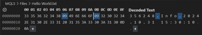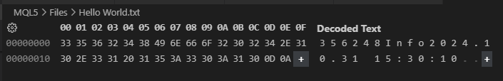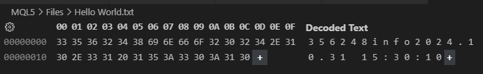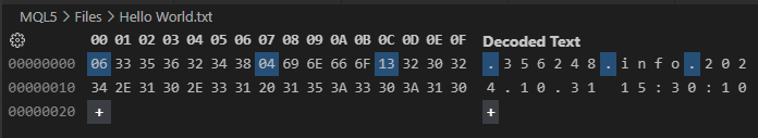 01. //+------------------------------------------------------------------+ 02. #property copyright "Daniel Jose" 03. //+------------------------------------------------------------------+ 04. void OnStart(void) 05. { 06. int handle, 07. start = 1; 08. uchar arr[]; 09. 10. const datetime dt = D'31.10.2024 15:30:10'; 11. const int i32 = 356248; 12. 13. if ((handle = FileOpen("Hello World.txt", FILE_WRITE | FILE_READ | FILE_BIN)) == INVALID_HANDLE) 14. { 15. Print("Error..."); 16. return; 17. }; 18. 19. start += arr[start - 1] = (uchar) StringToCharArray((string)i32, arr, start); 20. start += arr[start - 1] = (uchar) StringToCharArray("info", arr, start); 21. start += arr[start - 1] = (uchar) StringToCharArray(StringFormat("%s", TimeToString(dt, TIME_DATE | TIME_SECONDS)), arr, start); 22. 23. FileWriteArray(handle, arr, 0, start - 1); 24. FileFlush(handle); 25. 26. ArrayFree(arr); 27. 28. FileSeek(handle, 0, SEEK_SET); 29. FileReadArray(handle, arr); 30. 31. FileClose(handle); 32. 33. for (uint i = 0; i < arr.Size(); i+= arr[i]) 34. Print(i, " >> ", CharArrayToString(arr, i + 1, arr[i])); 35. } 36. //+------------------------------------------------------------------+