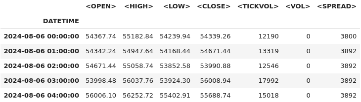 # Combine <DATE> and <TIME> into a single datetime column and set it as the index btc_data['DATETIME'] = pd.to_datetime(btc_data['<DATE>'] + ' ' + btc_data['<TIME>']) btc_data.set_index('DATETIME', inplace=True) # Drop the original <DATE> and <TIME> columns as they're no longer needed btc_data.drop(columns=['<DATE>', '<TIME>'], inplace=True) # Display the first few rows after modifications btc_data.head()