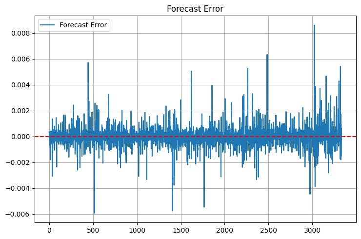O MSE foi absurdamente baixo: 0,00000094. Para quem não é do meio: isso significa que o erro médio da previsão é menor que um pip. Qualquer trader vai te dizer: isso está além do sonho. O MAPE de 0,06% só confirma a precisão impressionante. A maioria dos sistemas comerciais já comemora erro de 1–2%; aqui estamos falando de um desempenho dez vezes melhor.