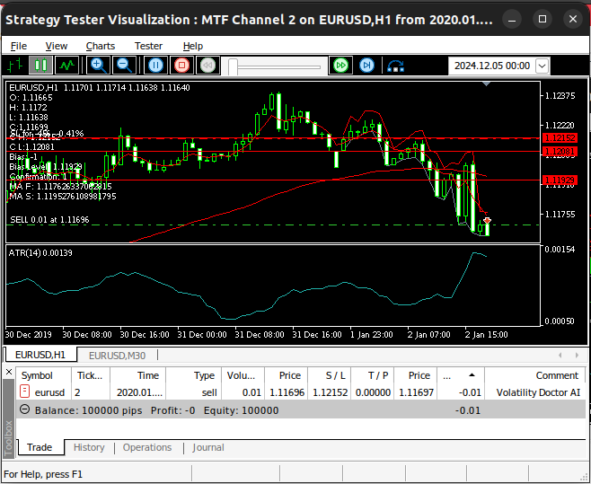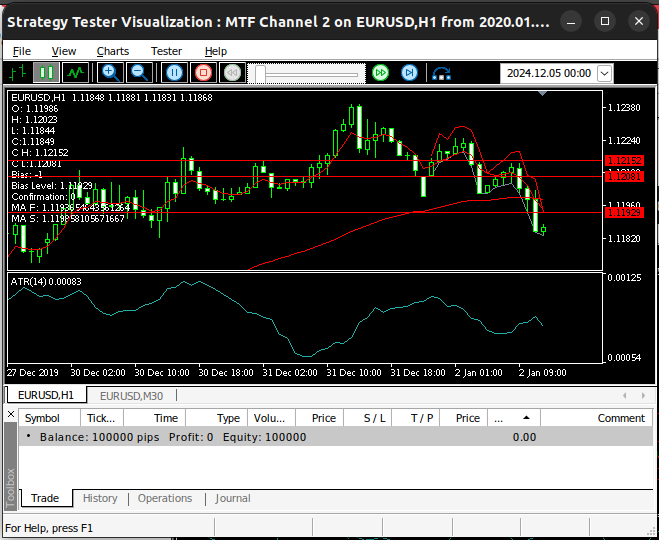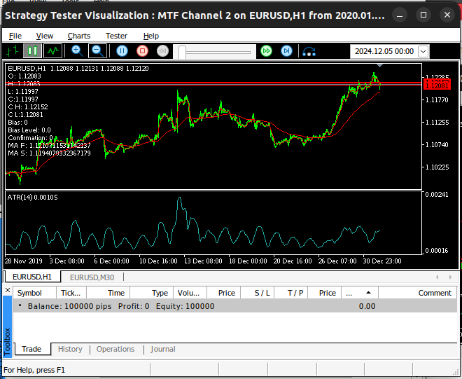 Esta versão da nossa aplicação será intitulada “MTF EURUSD Channel”. A primeira versão que criamos era mais generalizada e poderia facilmente ser usada para negociar qualquer outro símbolo em nosso terminal. No entanto, esta versão usará os pares EURGBP e GBPUSD como referências e, portanto, é mais especializada e destinada apenas a negociar o par EURUSD. O leitor observará que nossas condições de teste são idênticas às do primeiro teste. Realizaremos este backtest usando o mesmo período de tempo e nas mesmas datas do primeiro teste, de 1º de janeiro de 2020 até 30 de novembro de 2024.