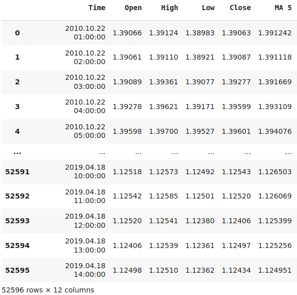 #Define the forecast horizon look_ahead = 24 #Read in the data data = pd.read_csv('Market Data EURUSD MA Cross As Series.csv') #Drop the last 4 years data = data.iloc[:(-24 * 365 * 4),:] data.reset_index(drop=True,inplace=True) #Label the data data['Target'] = data['Close'].shift(-look_ahead) data['MA 5 Target'] = data['MA 5'].shift(-look_ahead) data['MA 5 Close Target'] = data['Target'] - data['MA 5 Target'] data['MA 60 Target'] = data['MA 60'].shift(-look_ahead) data['MA 60 Close Target'] = data['Target'] - data['MA 60 Target'] data.dropna(inplace=True) data.reset_index(drop=True,inplace=True) data