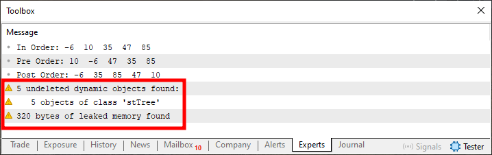 Isto que está sendo marcado na imagem 01, é de fato um erro. Justamente por conta de que estamos alocando recursos e não os estamos devolvendo. No caso o recurso alocado, se trata justamente de memória. No entanto, para evitar uma rápida degradação deste recurso, o MetaTrader 5, a está liberando de maneira um tanto quanto forçada. O que impõem um certo esforço de processamento extra que a plataforma terá de fazer. Algo que pode ser perfeitamente evitado.